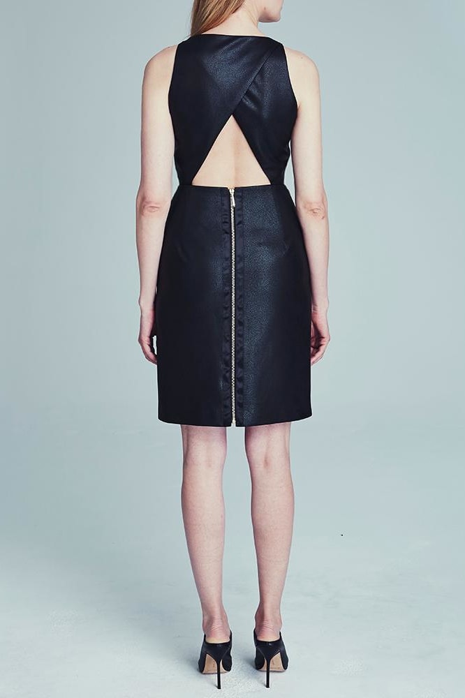 Leather textured fitted dress. Gold metal zip closure at back skirt. Crossback shoulders with open triangle at back. Gold metal clasps at shoulders for the finishing touch. This style runs small, please size up if you are in between sizes.